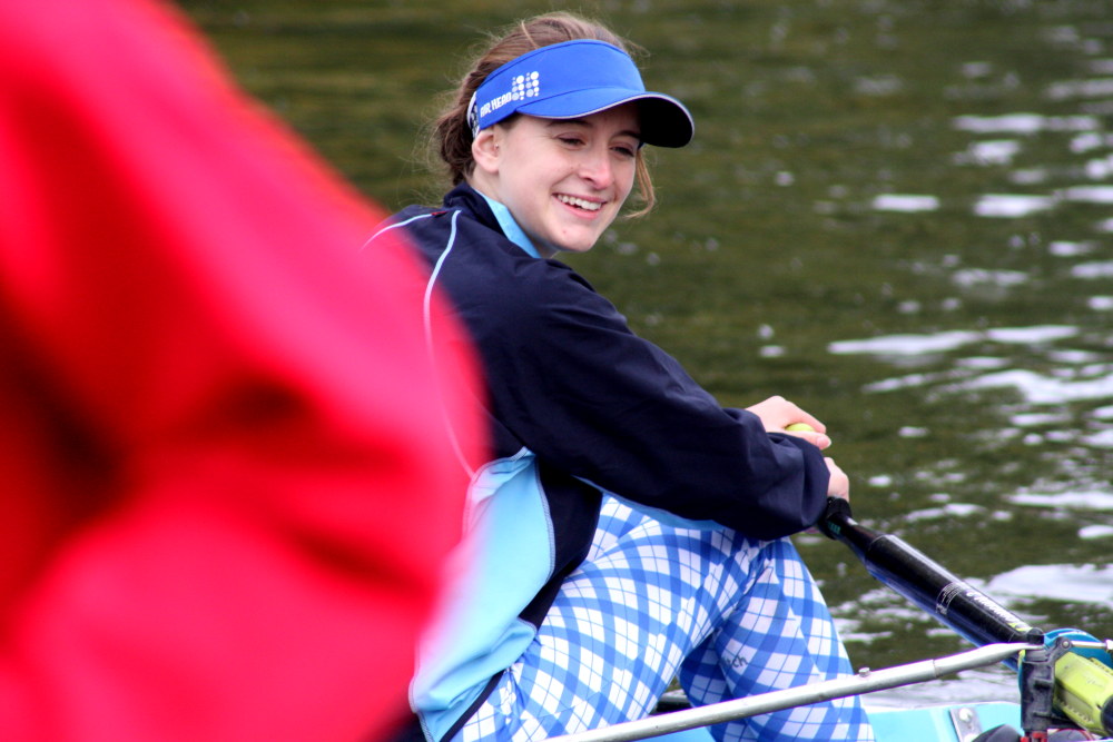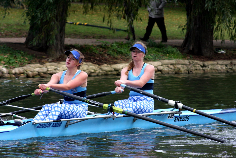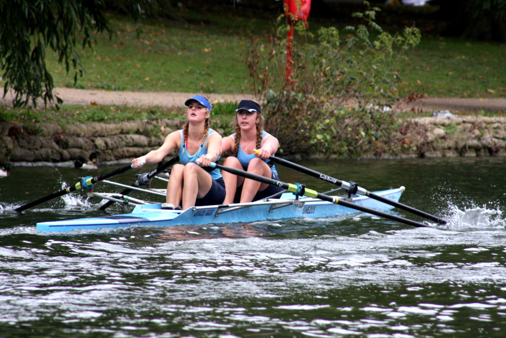 In the afternoon divisions, St Neots junior rowers Zoe Adamson and Kate Lyster (pictured) took part in the women’s under 16 double scull class (WJ162x). They took on 10 crews from 5 other clubs, winning by a comfortable margin of 20 seconds ahead of the the pairing of Taylor and Brown from Bedford’s Star club. Later in the day, Kate Lyster was then drafted in as a substitute for an absent rower in another WJ162x boat, teaming up with newcomer Claudia Lee who was taking part in a ‘head’ event for the first time. The pair who had never even practiced together prior to the Bedford event, were delighted with their 5th place finish which put them ahead of crews from Oundle Town, Bedford Modern School and Emanuel School.